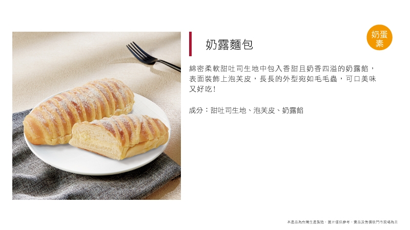 綿密柔軟甜吐司生地中包入香甜且奶香四溢的奶露餡,表面裝飾上泡芙皮,長長的外型宛如毛毛蟲,可口美味又好吃!