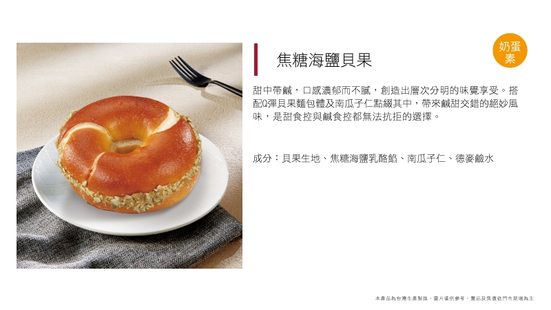 甜中帶鹹,口感濃郁而不膩,創造出層次分明的味覺享受。搭配Q彈貝果麵包體及南瓜子仁點綴其中,帶來鹹甜交錯的絕妙風味,是甜食控與鹹食控都無法抗拒的選擇。
