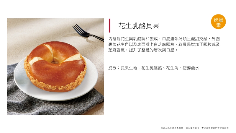 內餡為花生與乳酪調和製成,口感濃郁滑順且鹹甜交融,外圍裹著花生角以及表面撒上白芝麻顆粒,為貝果增加了顆粒感及芝麻香氣,提升了整體的層次與口感。