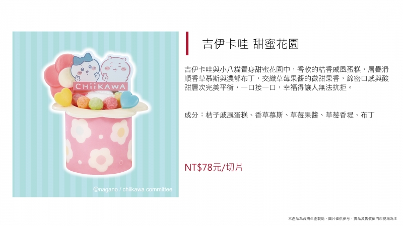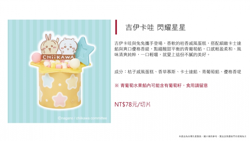 吉伊卡哇與兔兔攜手登場,香軟的桔香戚風蛋糕,搭配細緻卡士達餡與爽口優格香緹,點綴酸甜平衡的青葡萄餡,口感輕盈柔和、風味清爽純粹,一口輕嚐,就愛上這份不膩的美好。