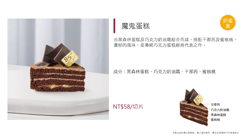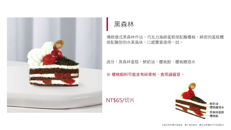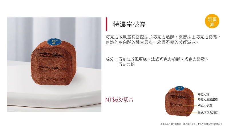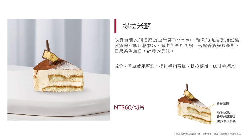 進口動物性鮮奶油加入澳洲乳酪及義大利MASCARPONE乳酪而製成的提拉米蘇慕斯,再抹上特製香草鮮奶油,風味可口清爽口感濕潤綿密、甜度適中,相信一定能滿足你挑剔的味蕾!