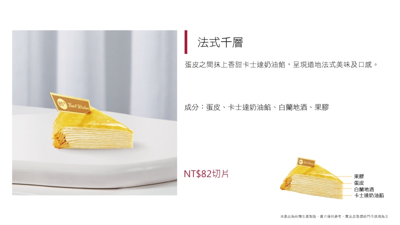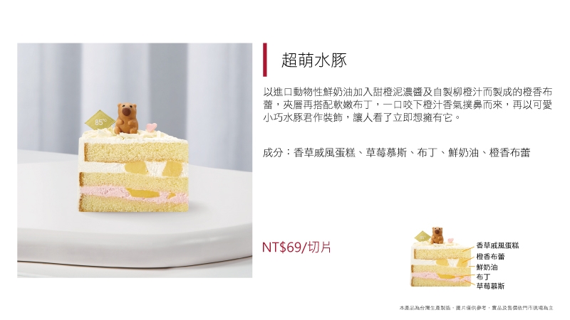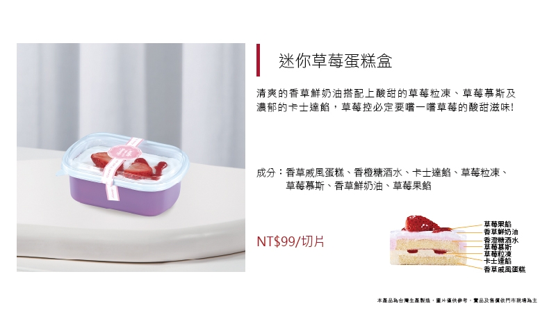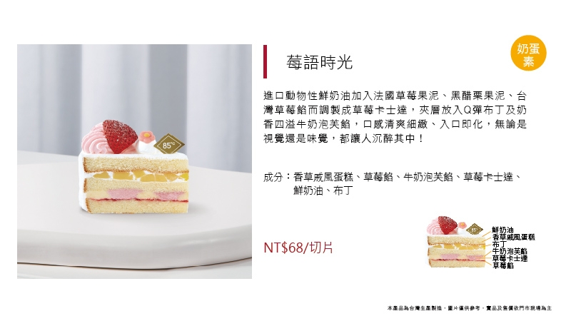進口動物性鮮奶油加入法國草莓果泥、黑醋栗果泥、台灣草莓餡而調製成草莓卡士達,夾層放入Q彈布丁及奶香四溢牛奶泡芙餡,口感清爽細緻、入口即化,無論是視覺還是味覺,都讓人沉醉其中!