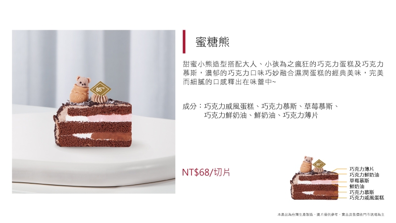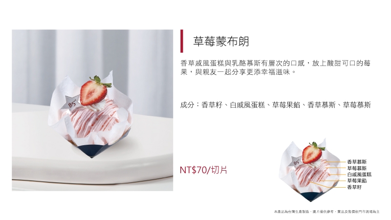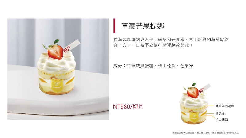 進口動物性鮮奶油為基底加入草莓慕斯粉而製成的草莓慕斯,另加入進口奶油乳酪及進口MASCARPONE而製成的提拉米蘇慕斯,滋味濃郁飽滿,口感卻輕盈細滑又涼爽,令人忍不住一口接著一口停不下來~