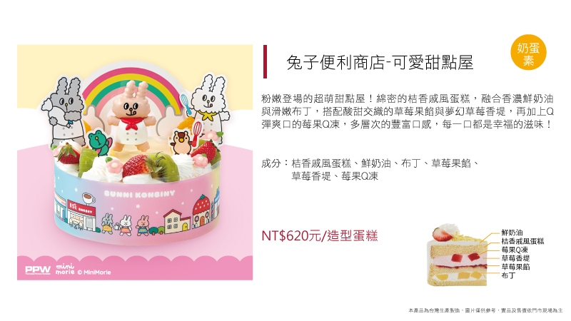 粉嫩登場的超萌甜點屋!綿密的桔香戚風蛋糕,融合香濃鮮奶油與滑嫩布丁,搭配酸甜交織的草莓果餡與夢幻草莓香堤,再加上Q彈爽口的莓果Q凍,多層次的豐富口感,每一口都是幸福的滋味!