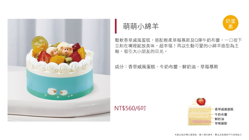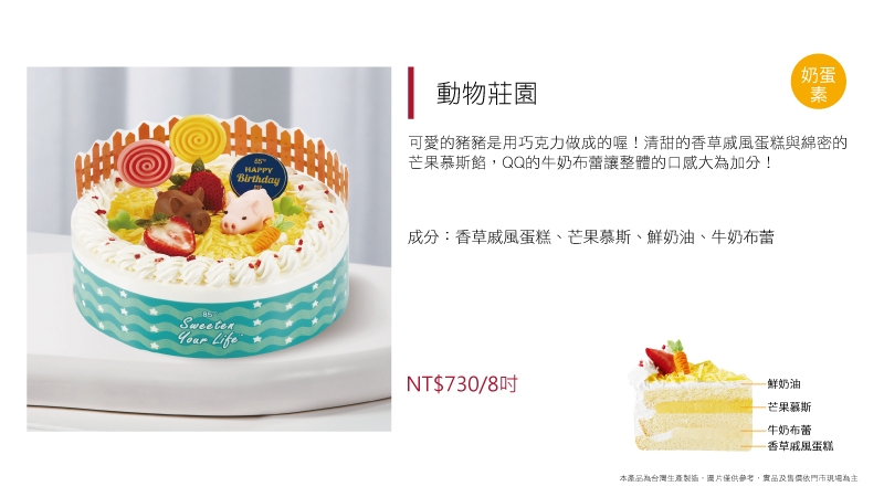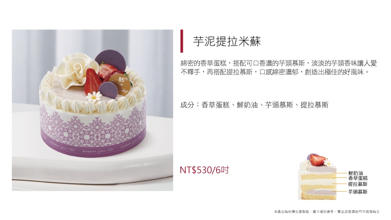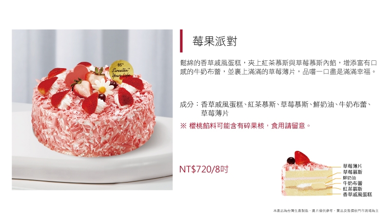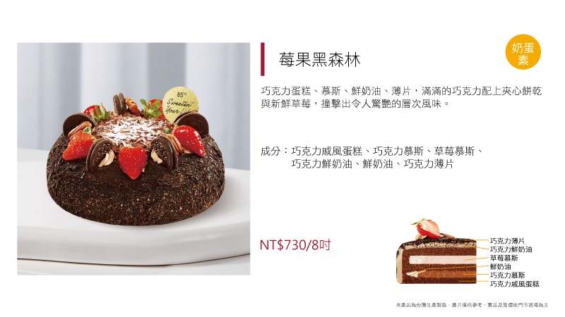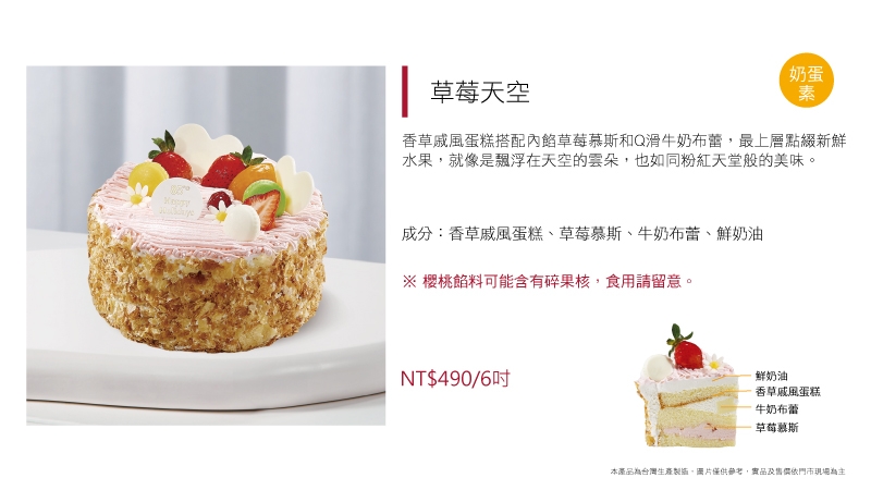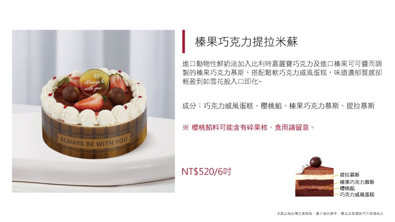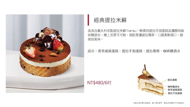 進口動物性鮮奶油為基底加入草莓慕斯粉而製成的草莓慕斯,另加入進口奶油乳酪及進口MASCARPONE而製成的提拉米蘇慕斯,滋味濃郁飽滿,口感卻輕盈細滑又涼爽,令人忍不住一口接著一口停不下來~