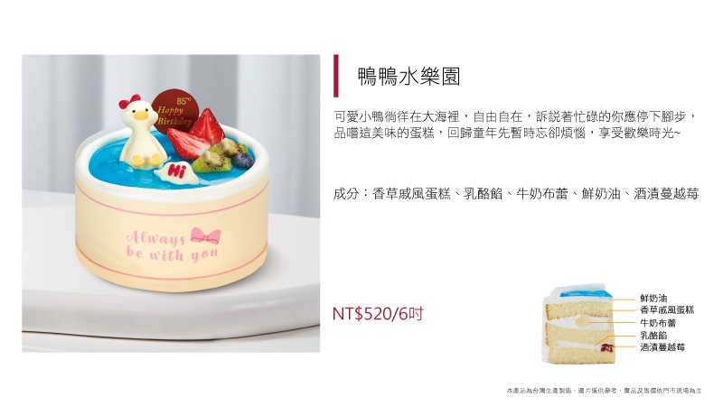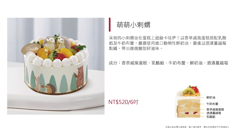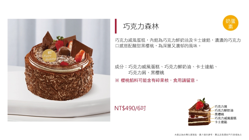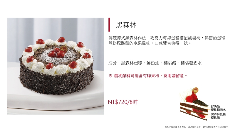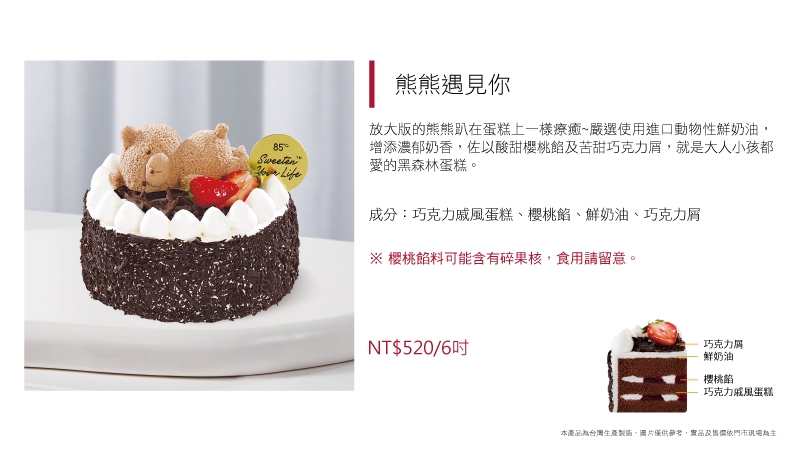 放大版的熊熊趴在蛋糕上一樣療癒~嚴選使用法國愛樂薇動物性鮮奶油,增添濃郁奶香,佐以酸甜櫻桃餡及苦甜巧克力屑,就是大人小孩都愛的黑森林蛋糕。