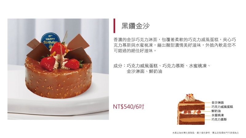 進口動物性鮮奶油加入比利時嘉麗寶巧克力及進口榛果可可醬而調製的榛果巧克力慕斯,搭配鬆軟巧克力戚風蛋糕,味道濃郁質感卻輕盈到如雪花般入口即化~