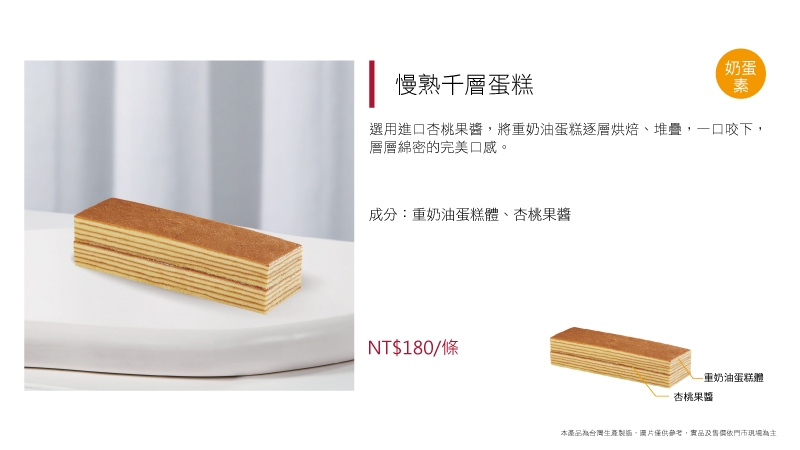 選用進口杏桃果醬,將重奶油蛋糕逐層烘焙、堆疊,一口咬下,層層綿密的完美口感。