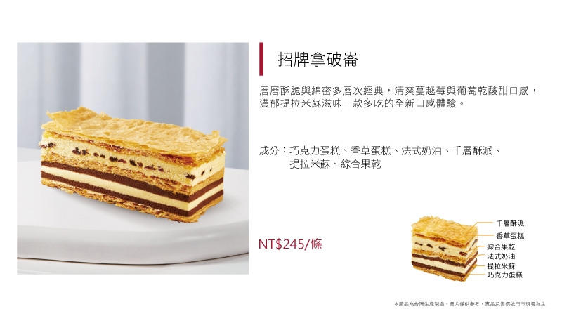 層層酥脆與綿密多層次經典,清爽蔓越莓與葡萄乾酸甜口感,濃郁提拉米蘇滋味,一款多吃的全新口感體驗。