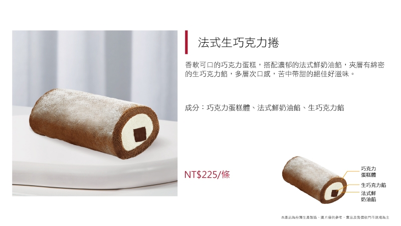 香軟可口的巧克力蛋糕,搭配濃郁的法式鮮奶油餡,夾層有綿密的生巧克力餡,多層次口感,苦中帶甜的絕佳好滋味。