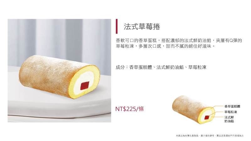 香軟可口的香草蛋糕,搭配濃郁的法式鮮奶油餡,夾層有Q彈的草莓粒凍,多層次口感,甜而不膩的絕佳好滋味。