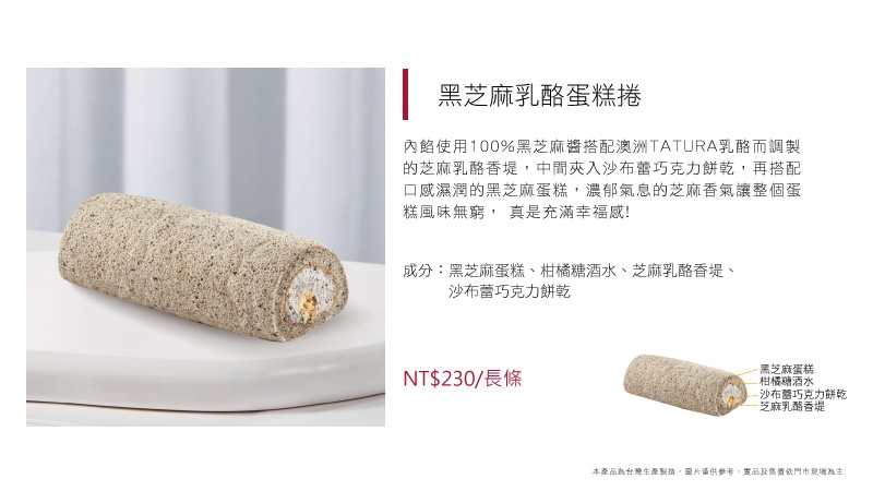 內餡使用100%黑芝麻醬搭配澳洲TATURA乳酪而調製的芝麻乳酪香堤,中間夾入沙布蕾巧克力餅乾,再搭配口感濕潤的黑芝麻蛋糕,濃郁氣息的芝麻香氣讓整個蛋糕風味無窮,真是充滿幸福感!