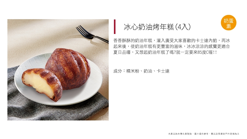 香香酥酥的奶油年糕,灌入廣受大家喜歡的卡士達內餡,再冰起來後,使奶油年糕有更豐富的滋味,冰冰涼涼的感覺更適合夏日品嚐,又想起奶油年糕了嗎?就一定要來85度C喔!!