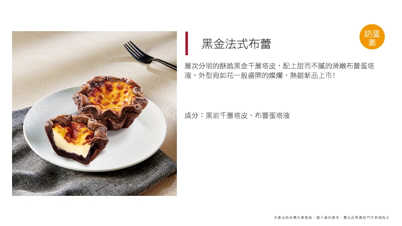 層次分明的酥脆黑金千層塔皮,配上甜而不膩的滑嫩布蕾蛋塔液,外型宛如花一般盛開的燦爛,熱銷新品上市!