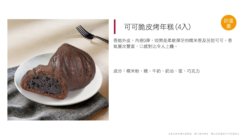 香脆外皮,內裡Q彈,咬開是柔軟彈牙的糯米香及苦甜可可,香氣層次豐富,口感對比令人上癮。