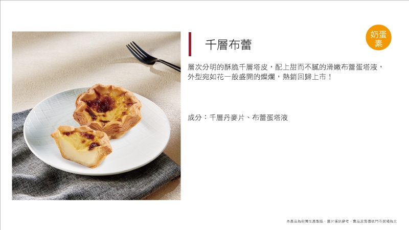 層次分明的酥脆千層塔皮,配上甜而不膩的滑嫩布蕾蛋塔液,外型宛如花一般盛開的燦爛,熱銷回歸上市!