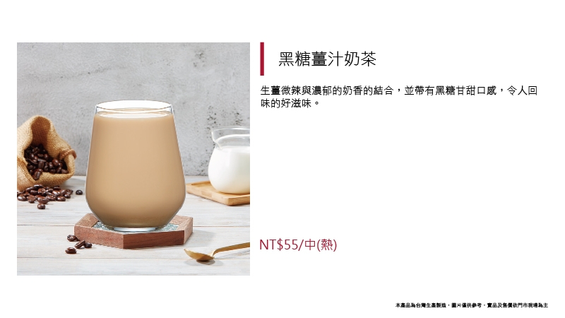 生薑微辣與濃郁的奶香的結合,並帶有黑糖甘甜口感,令人回味的好滋味。