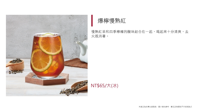 選用酸度適中的檸檬原汁,與完美比例的烏龍茶結合,口感獨特,清爽又冰涼。