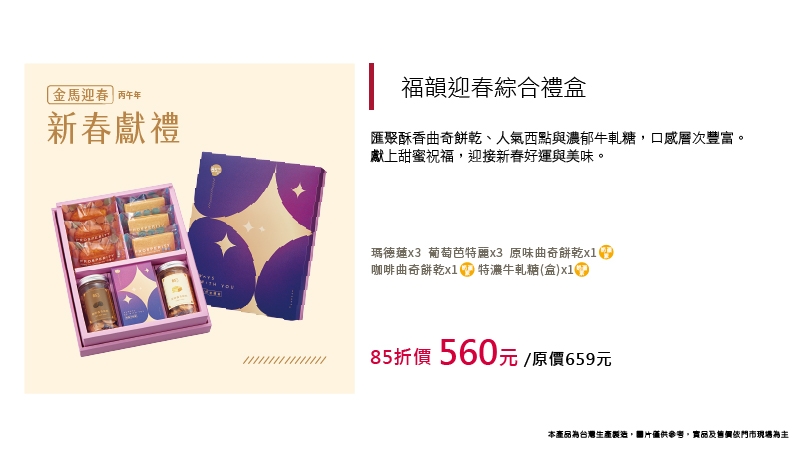 匯聚酥香曲奇餅乾、人氣西點與濃郁牛軋糖,口感層次豐富。獻上甜蜜祝福,迎接新春好運與美味。