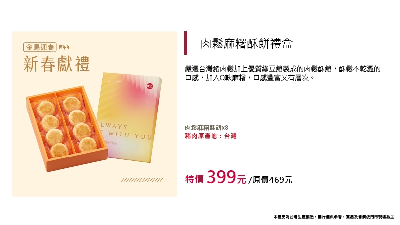 嚴選台灣豬肉鬆加上優質綠豆餡製成的肉鬆酥餡,酥鬆不乾澀的口感,加入Q軟麻糬,口感豐富又有層次。