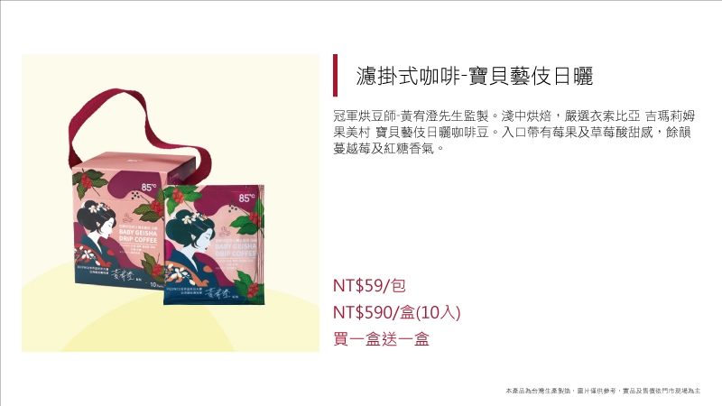 冠軍烘豆師X寶貝藝伎日曬淺中烘焙,嚴選衣索比亞吉瑪莉姆果美村寶貝藝伎日曬咖啡豆。入口帶有莓果及草莓酸甜感,餘韻蔓越莓及紅糖香氣。