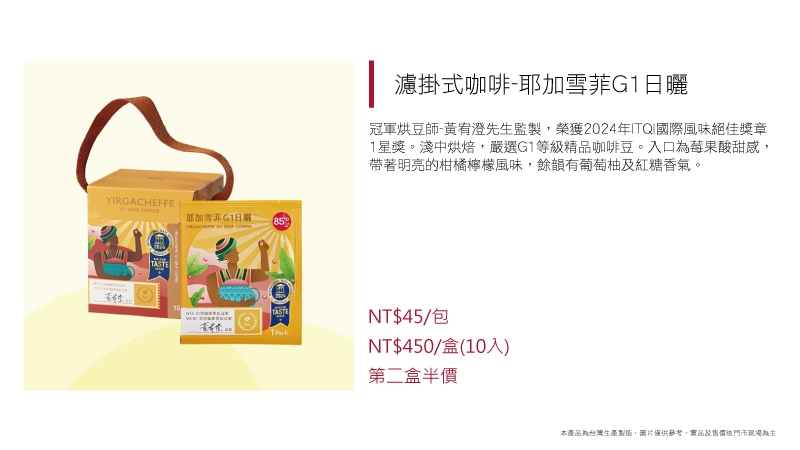 耶加雪菲G1日曬濾掛咖啡淺中烘焙,嚴選G1等級精品咖啡豆。入口為莓果酸甜感,帶著明亮的柑橘檸檬風味,餘韻有葡萄柚及紅糖香氣。