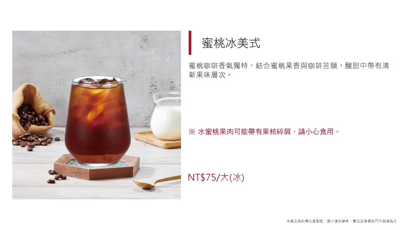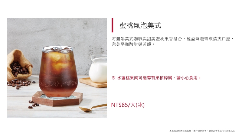 將濃郁美式咖啡與甜美蜜桃果香融合,輕盈氣泡帶來清爽口感,完美平衡酸甜與苦韻。